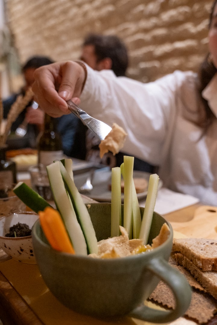 We start with an early dinner at a sustainable local spot serving seasonal dishes, organic wines, and veggie-friendly options.